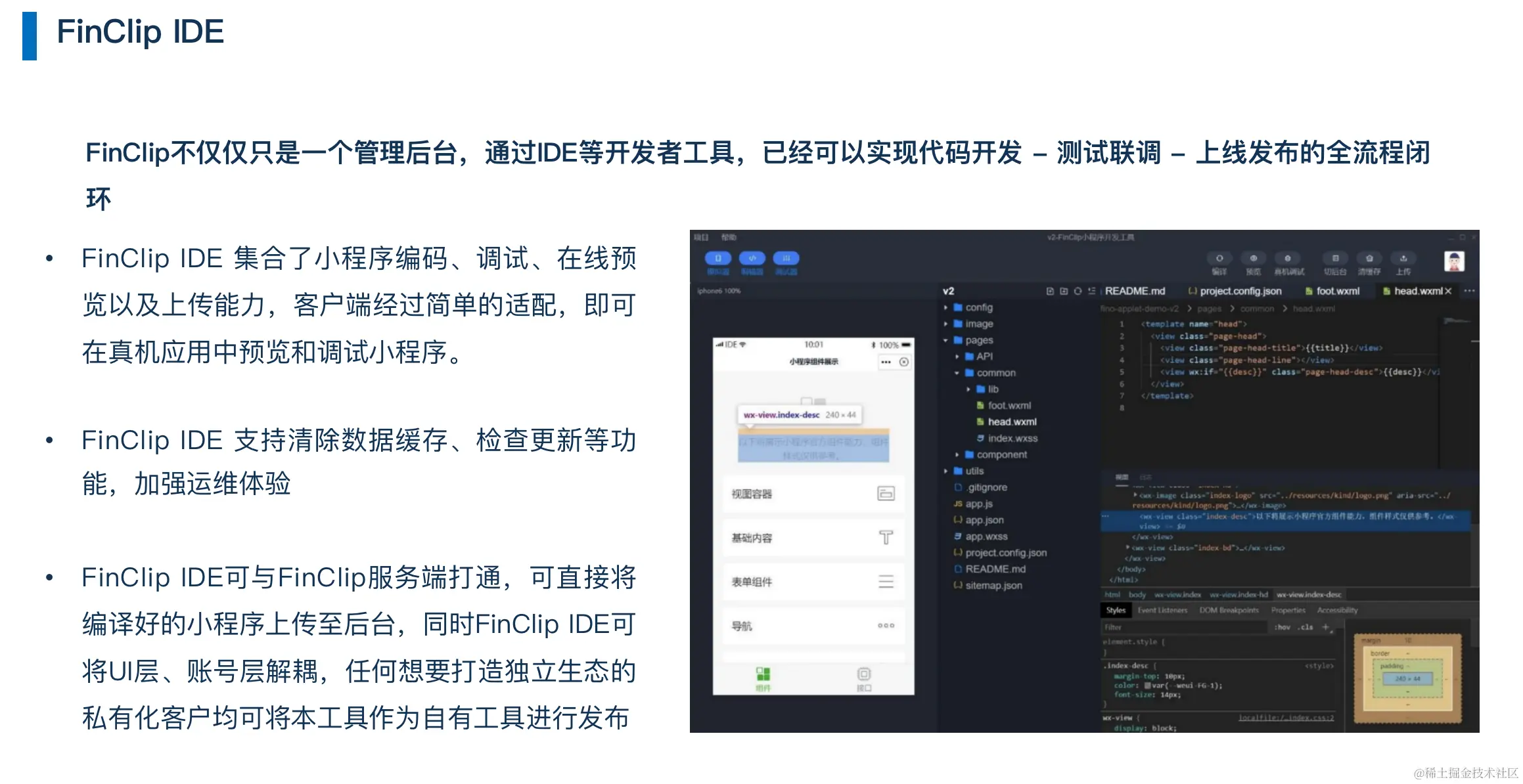 FinClip 还提供小程序 IDE 开发工具,界面与微信小程序的开发工具类似,自带调试和真机预览,简单易上手。你可以在这个 IDE 里面,对现有项目进行二次开发,扩展功能和接口,或者从零开始写出一个小程序。