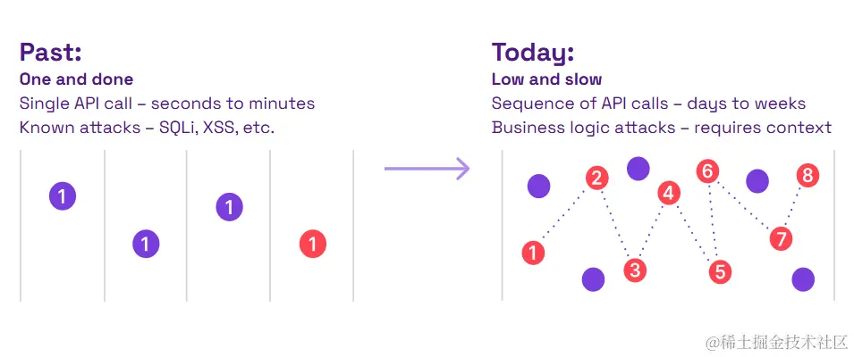 针对应用程序接口的恶意攻击者已经超越了传统的 “一劳永逸 “攻击,如 SQLi 和 XSS。他们现在的重点是寻找 API 业务逻辑中的漏洞。您的 API 是独一无二的,因此攻击也必须是独一无二的。攻击者需要花费几天、几周甚至几个月的时间来探测和学习 API,他们使用的是传统安全工具无法察觉的 “低慢 “技术。