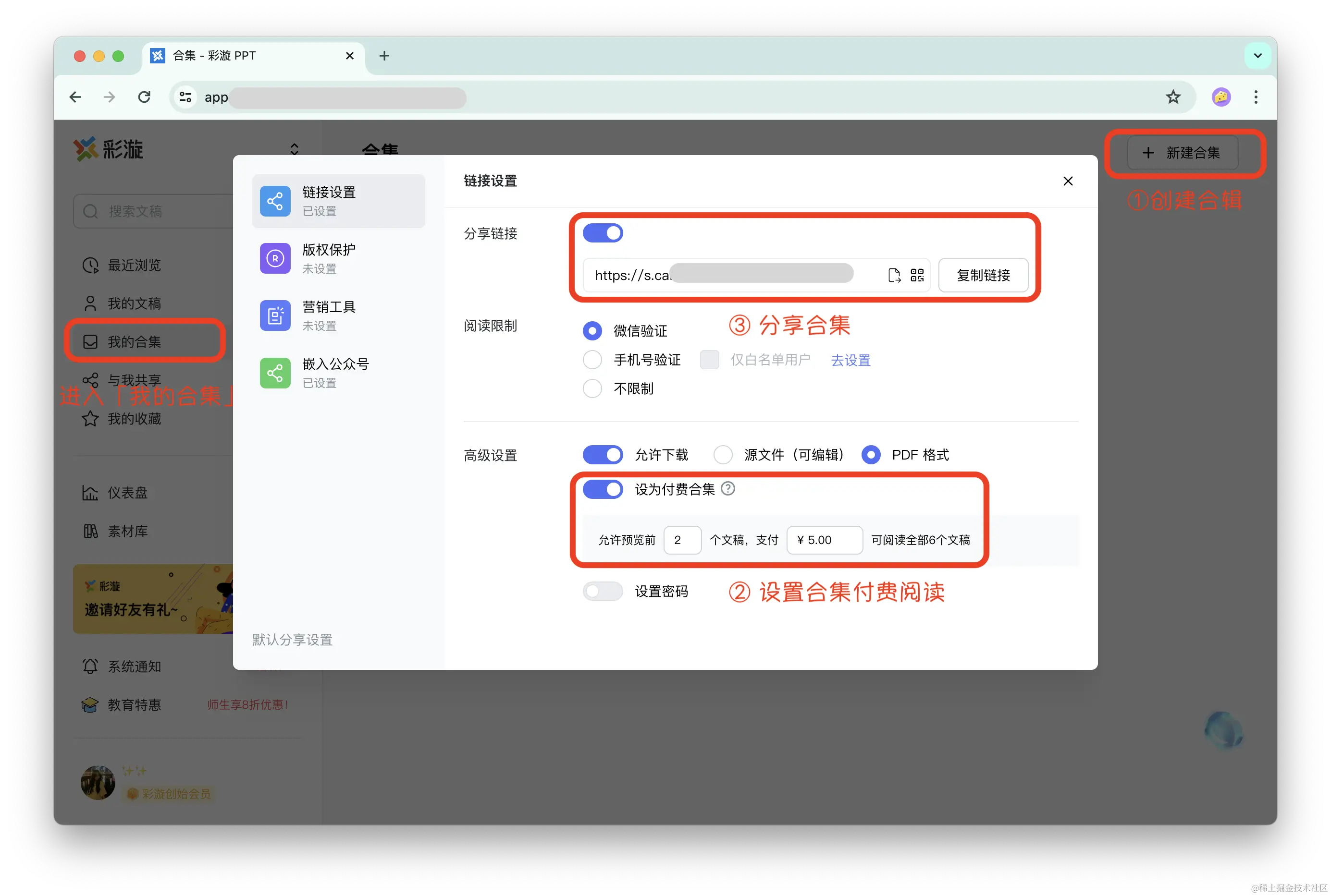 STEP 2:开启合集分享,在「链接设置」中启用「设为付费合集」,设定付费金额及可预览的文档数量