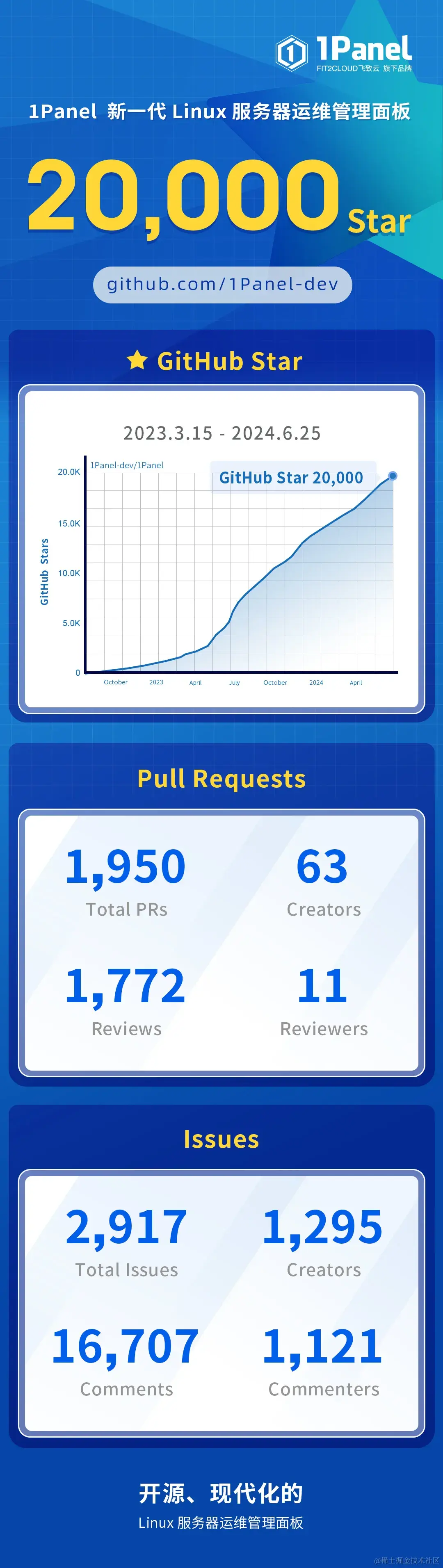 截至2024年6月25日9:00,FIT2CLOUD飞致云旗下开源项目——1Panel开源Linux服务器运维管理面板GitHub Star数超过20,000个!