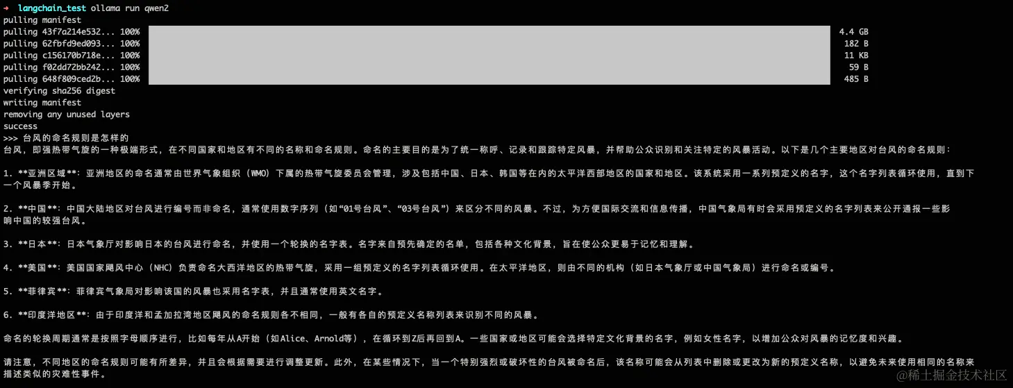上一步是首次安装模型,安装完成后再次运行 ollama run qwen2