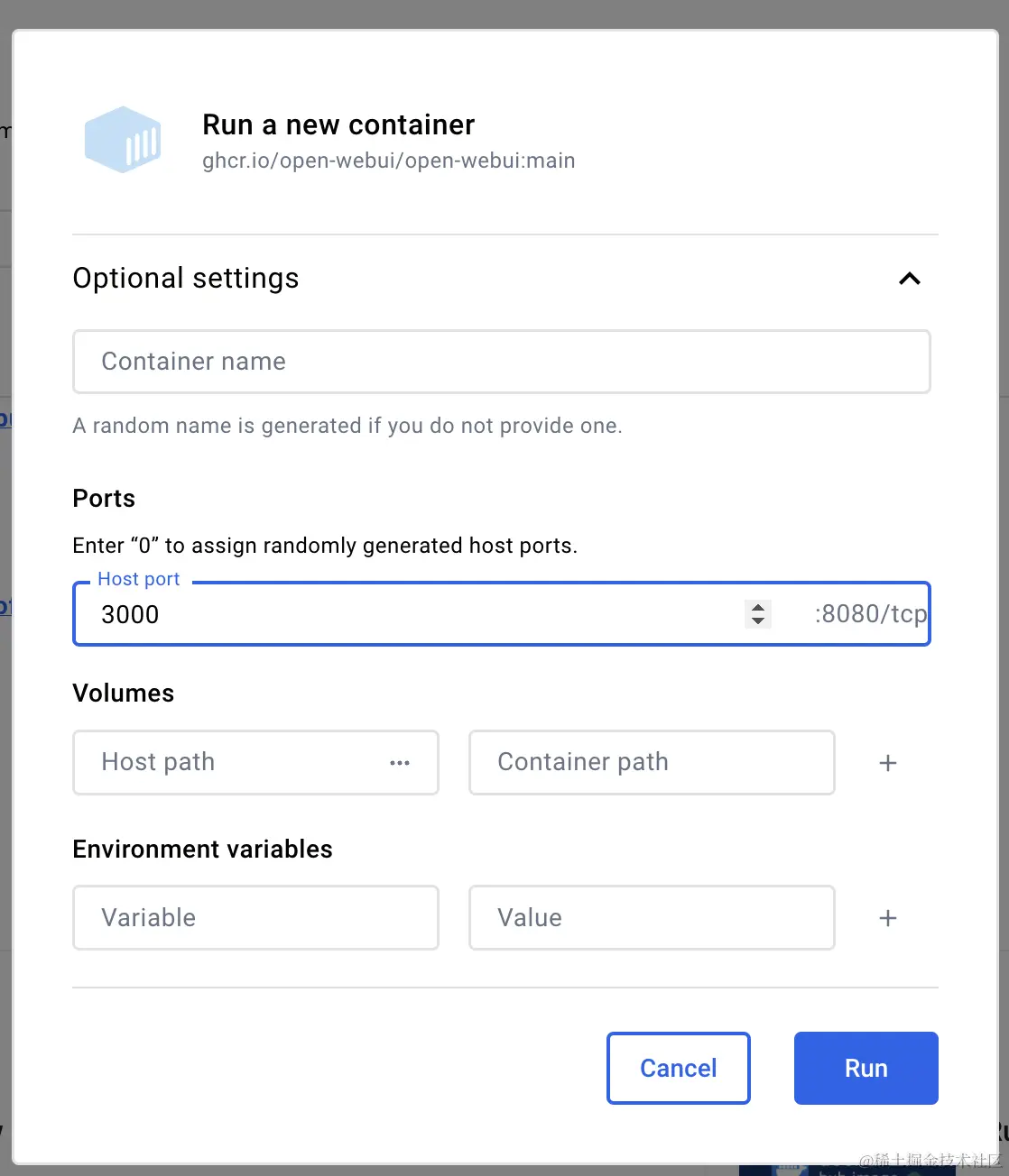 docker run -d -p 3000:8080 --add-host=host.docker.internal:host-gateway -v open-webui:/app/backend/data --name open-webui --restart always ghcr.io/open-webui/open-webui:main
