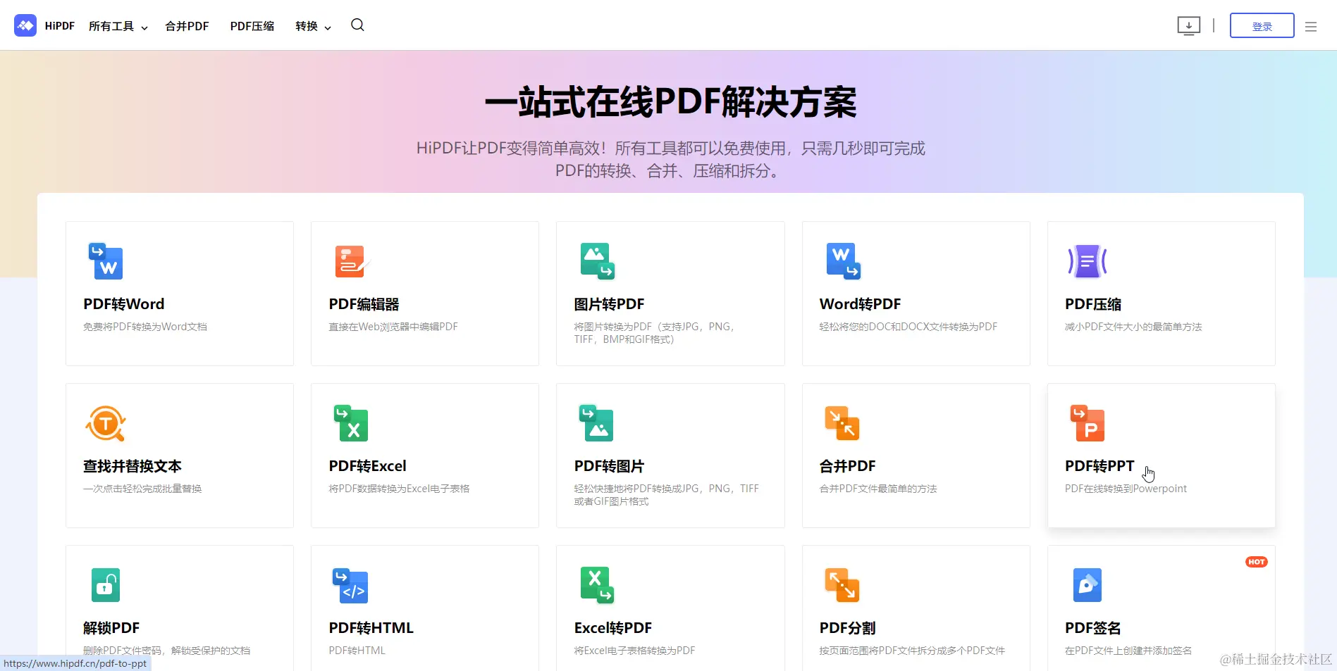 HiPDF是一个基于云端的工具集网站,集成了办公常用的各类格式转换工具,包含我们想使用的PDF转PPT工具,如下图所示,点击选用对应的工具,按照指引上传文件,即可将PDF快速转换为PPT文件。