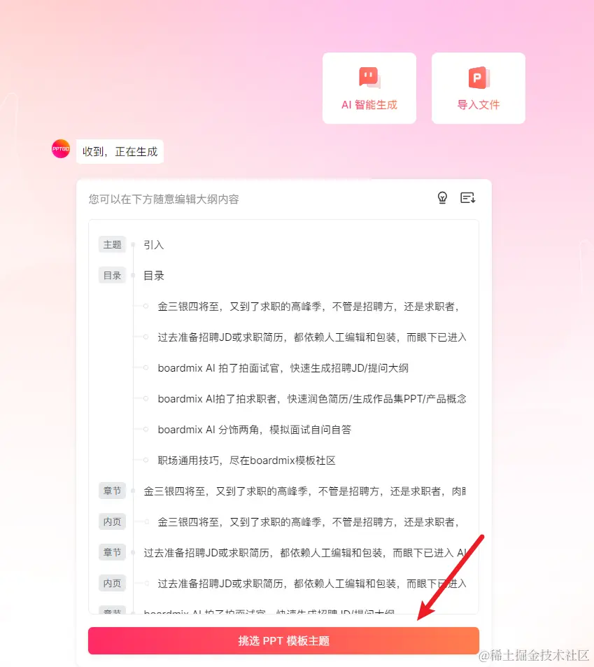 - 导入文件生成PPT:博思AIPPT将自动智能提炼生成专业的PPT,告别繁琐的排版,让您的PPT脱颖而出。支持多种文件格式,包括Word、PDF、TXT、Markdown等,满足您的不同需求。