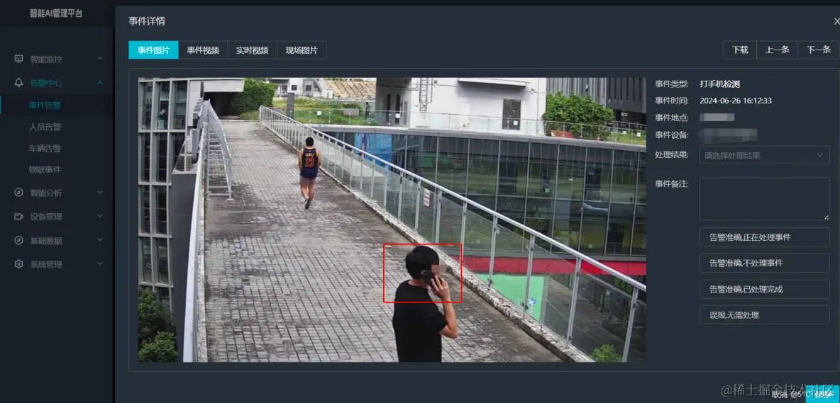 - 基于提取的特征,算法运用机器学习或深度学习模型进行行为识别,判断目标是否正在进行打手机行为。