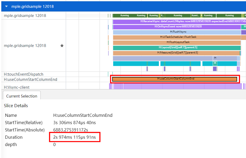 如图1所示,使用columnStart,columnEnd设置GridItem大小的布局方式,从自定义打点标签“H:useColumnStartColumnEndGrid”上可以看出从调用scrollToIndex到查找到指定Index准备构建GridItem节点耗时2974ms。