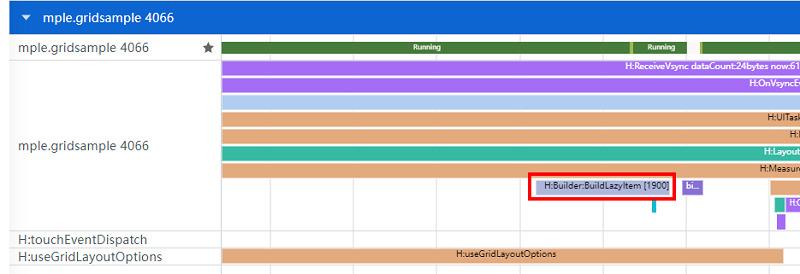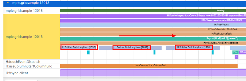 如图2所示,在“H:useColumnStartColumnEndGrid”打点标签时间段中存在大量的“H:Builder:BuildLazyItem”标签,可以发现Grid在查找指定的Index:1900是依次遍历Index来查找的。
