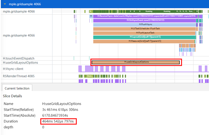 如图3所示,使用GridLayoutOptions设置GridItem大小的布局方式,从自定义打点标签“H:useGridLayoutOptions”上可以看出从调用scrollToIndex到查找到指定Index准备构建GridItem节点耗时464ms。