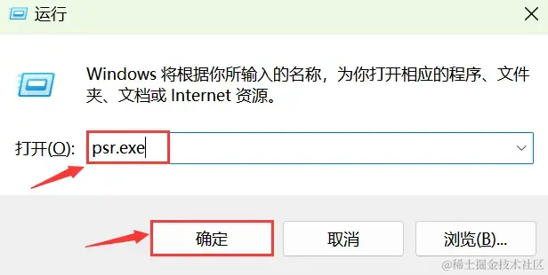 步骤2.:在【运行】页面的输入框中输入 【psr.exe】 ,直接点击 【确定】 即可。