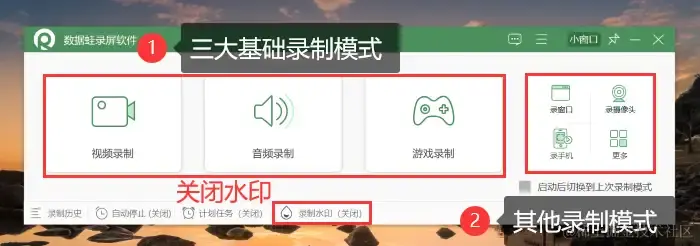 步骤2:进入软件的主界面,您可以根据您的需求选择录制模式。这里以 【视频录制】 为例。软件默认选择关闭下方的录制水印,轻松帮您录制出高清视频。