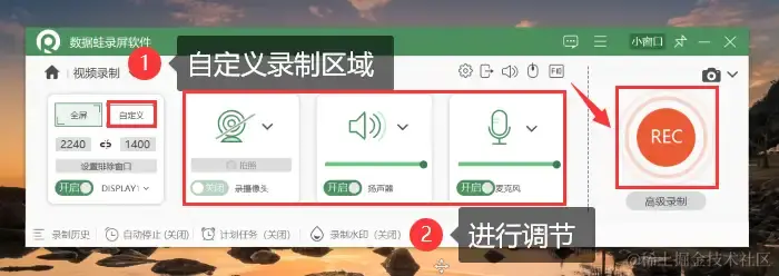 步骤3:在 【视频录制】 中您可以对录制范围自由选择,同时对摄像头、麦克风等进行调节,设置完毕后点击 【REC】 即可进入录制。
