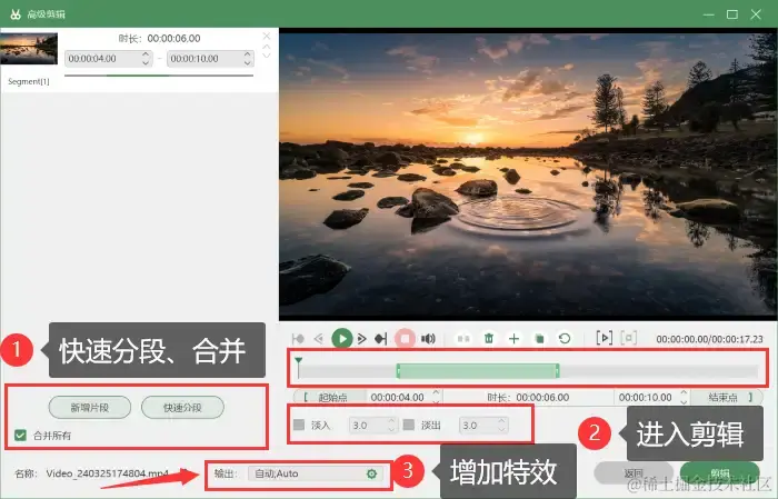 步骤4:录制完成的视频,您可以通过预览视频或者在历史记录中进入 【高级剪辑】 ,对视频进行分段、合并、剪辑、增加特效等功能。点击 【输出】 对导出的视频进行设置。