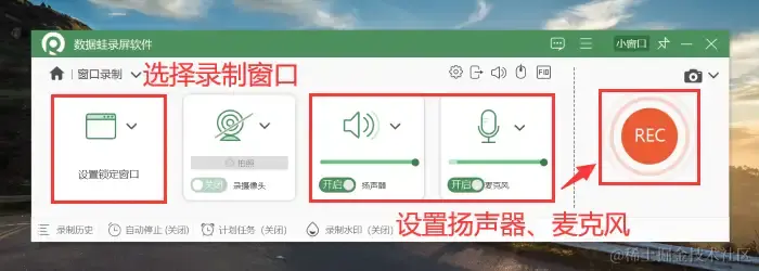 步骤3:在 【窗口录制】 中选择好网页录制窗口,调节好扬声器与麦克风。点击 【REC】 即可进入录制。
