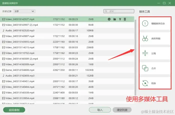 步骤5:录制完成后,您还可以对视频文件进行后期处理,可以进入 【录制历史】 页面中的 【媒体工具】 ,根据您的需求对视频进行压缩、合并、格式转换等后期处理。