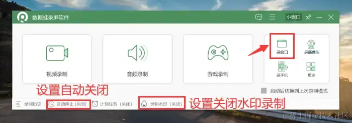 步骤2:在软件的主界面里选择 【录窗口】 模式。您可以设置自动关闭,为您节省时间,不用时刻紧盯网页的录制。同时为了录制出高清无水印的视频,可以选择关闭水印录制。