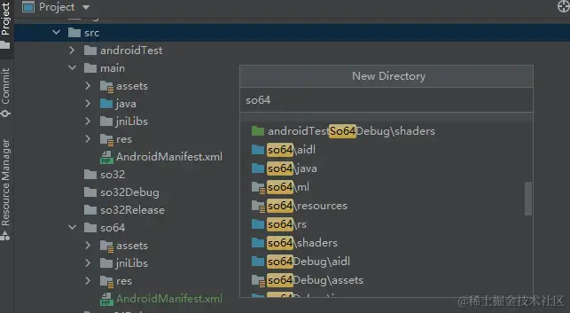 ① 在src目录下新增你确定要配置的源集目录,比如so32Debug、so64、debug