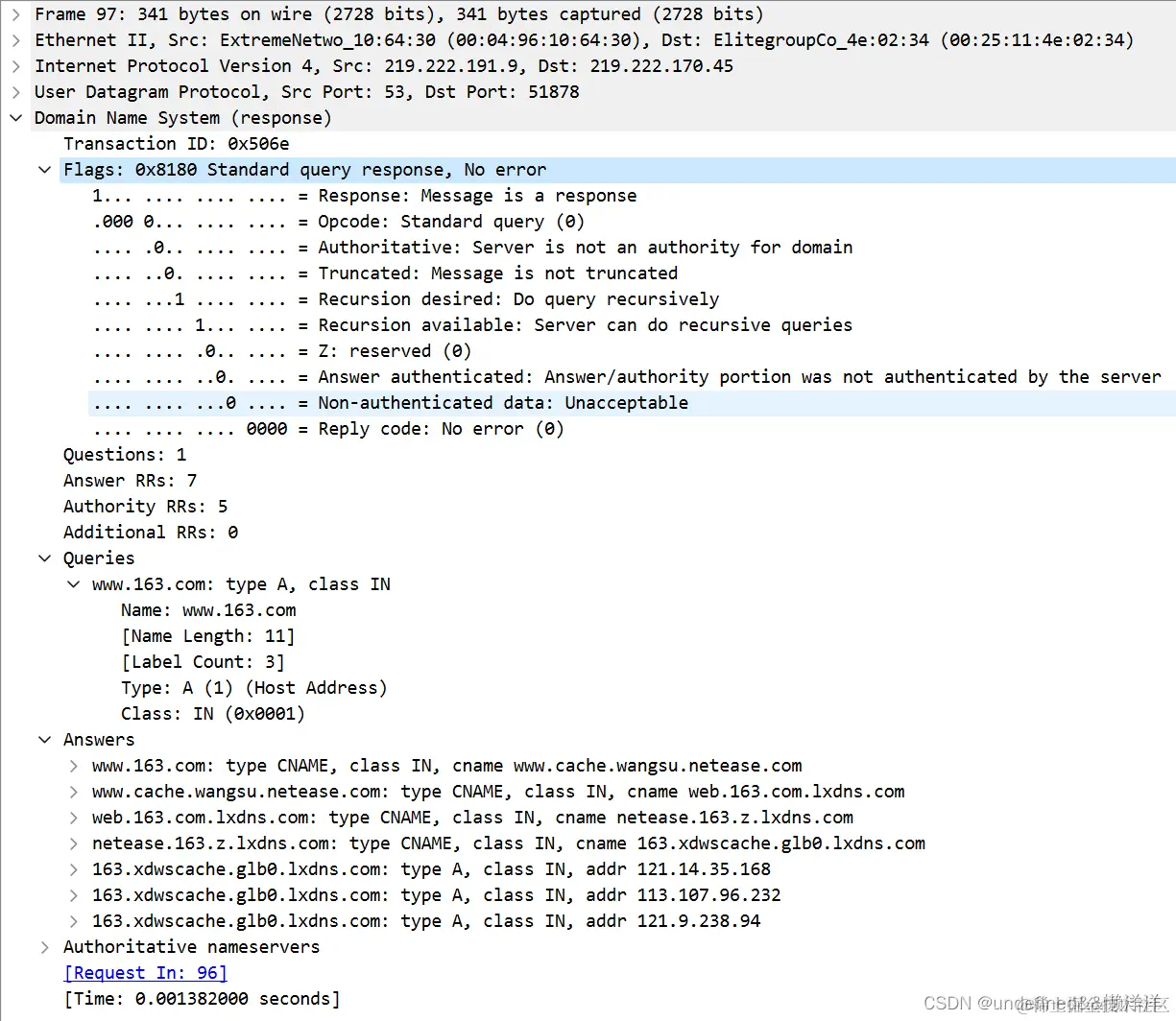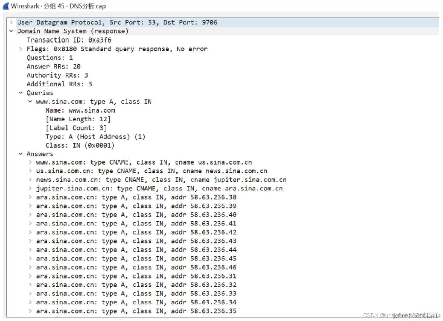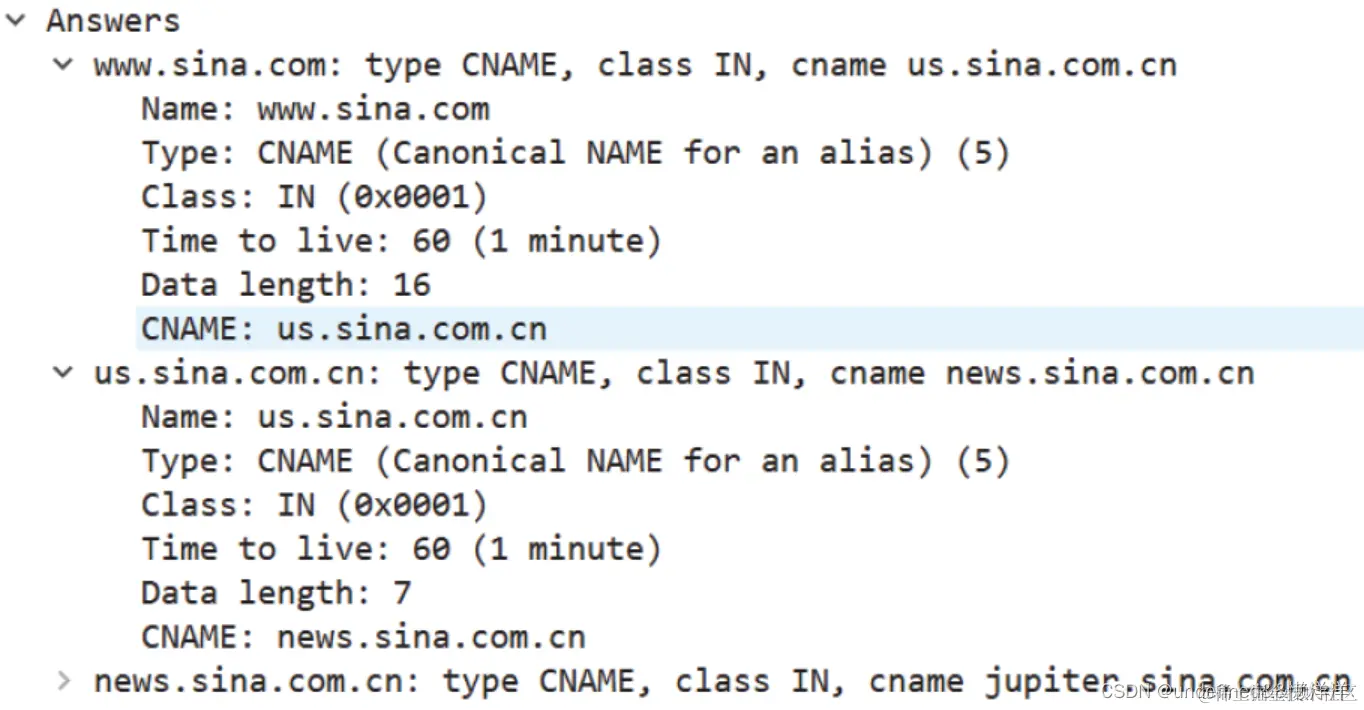 分组45是对分组43的应答,查询得到的域名记录解析如下: