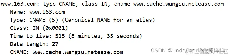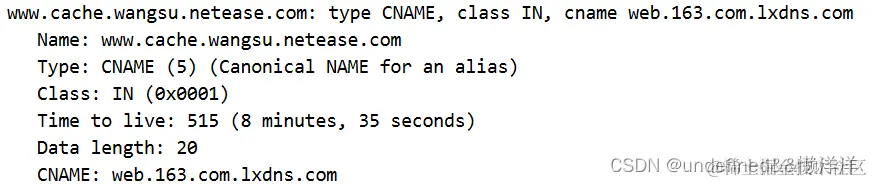 www.cache.wangsu.netease.com是别名www.163.com的规范主机名,TTL是515秒。