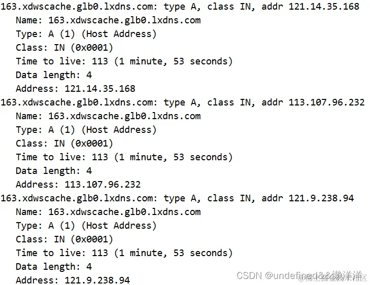 查寻的域名:www.163.com;查寻类型:主机地址;查寻类别:IP地址(class ,是一个16位值,标记协议族或某一个协议实例,使用IN代表internet系统,CH代表Chaos系统; class IN是一个32位IP地址 )