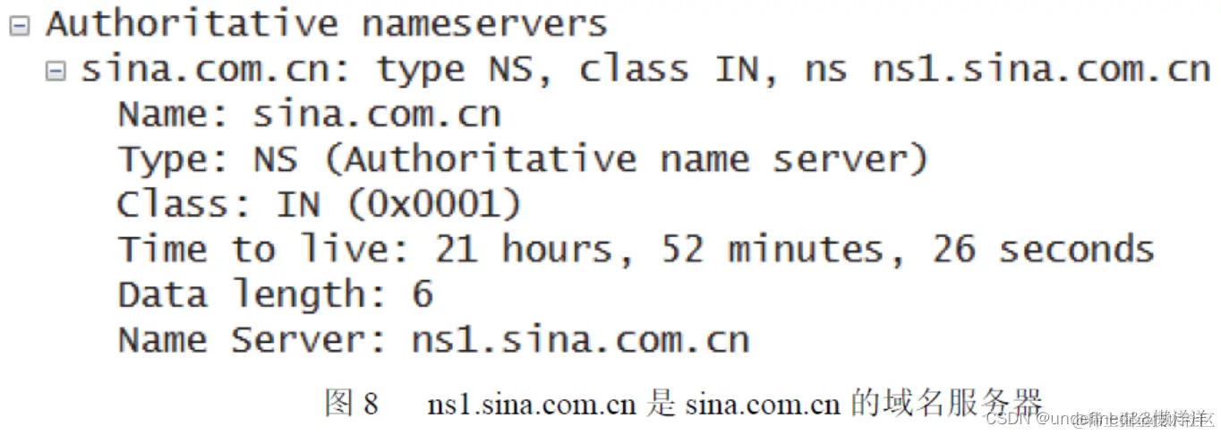 查寻的域名:www.sina.com;查寻类型:主机地址;查寻类别:IP地址(class ,是一个16位值,标记协议族或某一个协议实例,使用IN代表internet系统,CH代表Chaos系统; class IN是一个32位IP地址 )