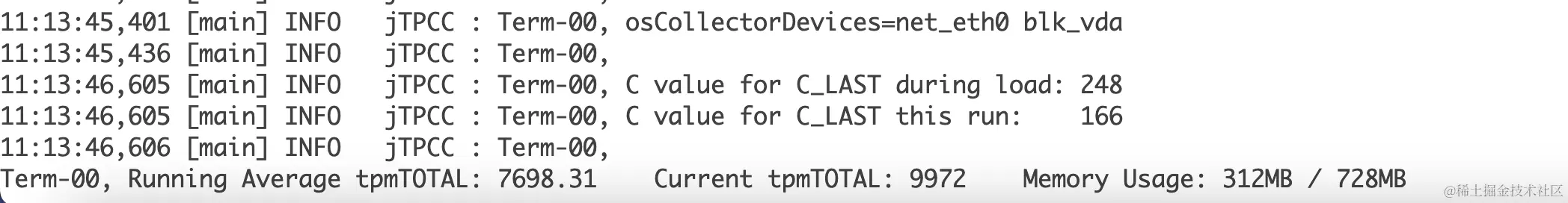 如下图,在使用 BenchmarkSQL(版本为 5.0)压测一段时间后,会出现卡住的现象,即 tpm TOTAL 的值不再发生变化,但通过 top 命令观测到 MySQL 当前的压力还是很大。