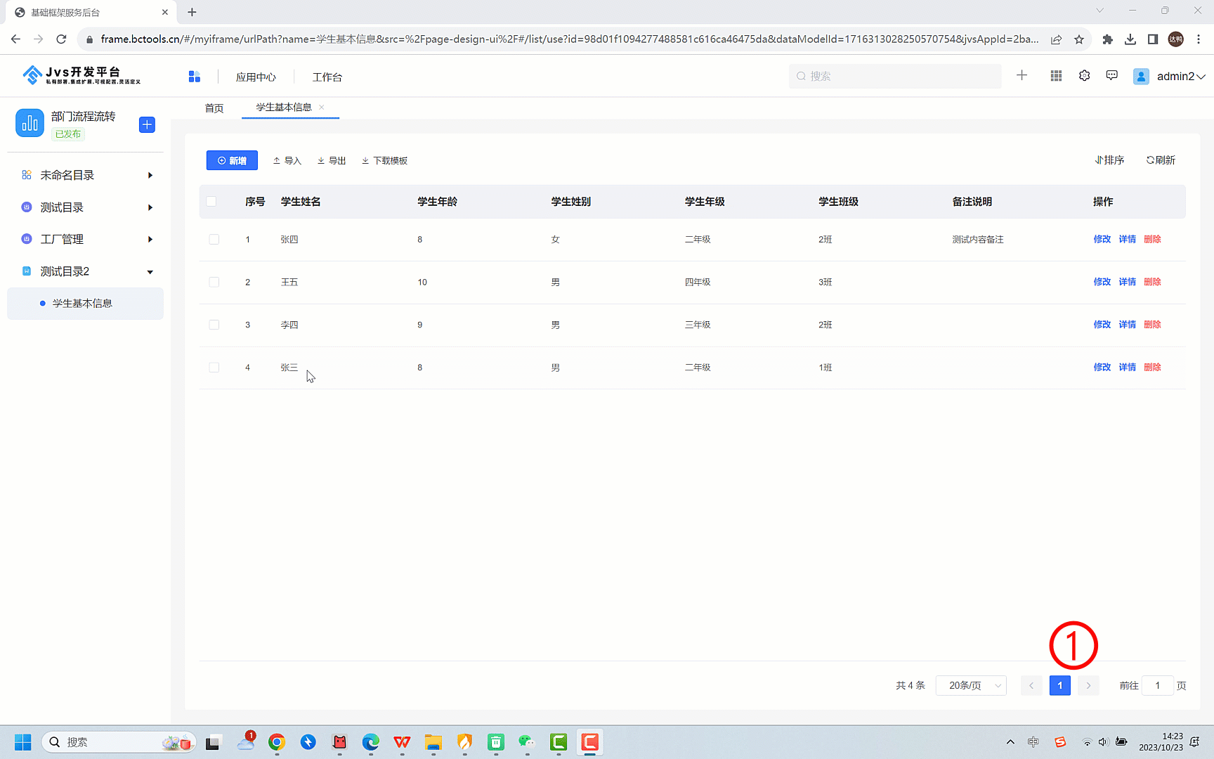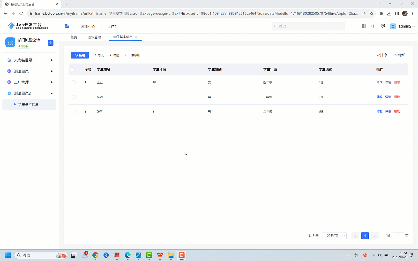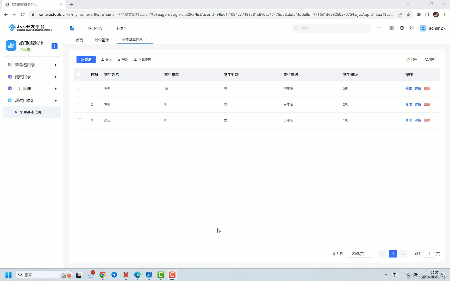 表单是低代码中最基础的业务配置引擎之一,它主要负责与人和系统之间的交互操作,弄清楚数据输入、数据存储,数据展示是快速配置应用的基础和前提,那么我们需要理解表单、列表、数据模型之间的关系。我们先来看一个最简单的场景:一个最简单的学生管理功能,我们从示例中去理解三者之间的关系,先看下图: