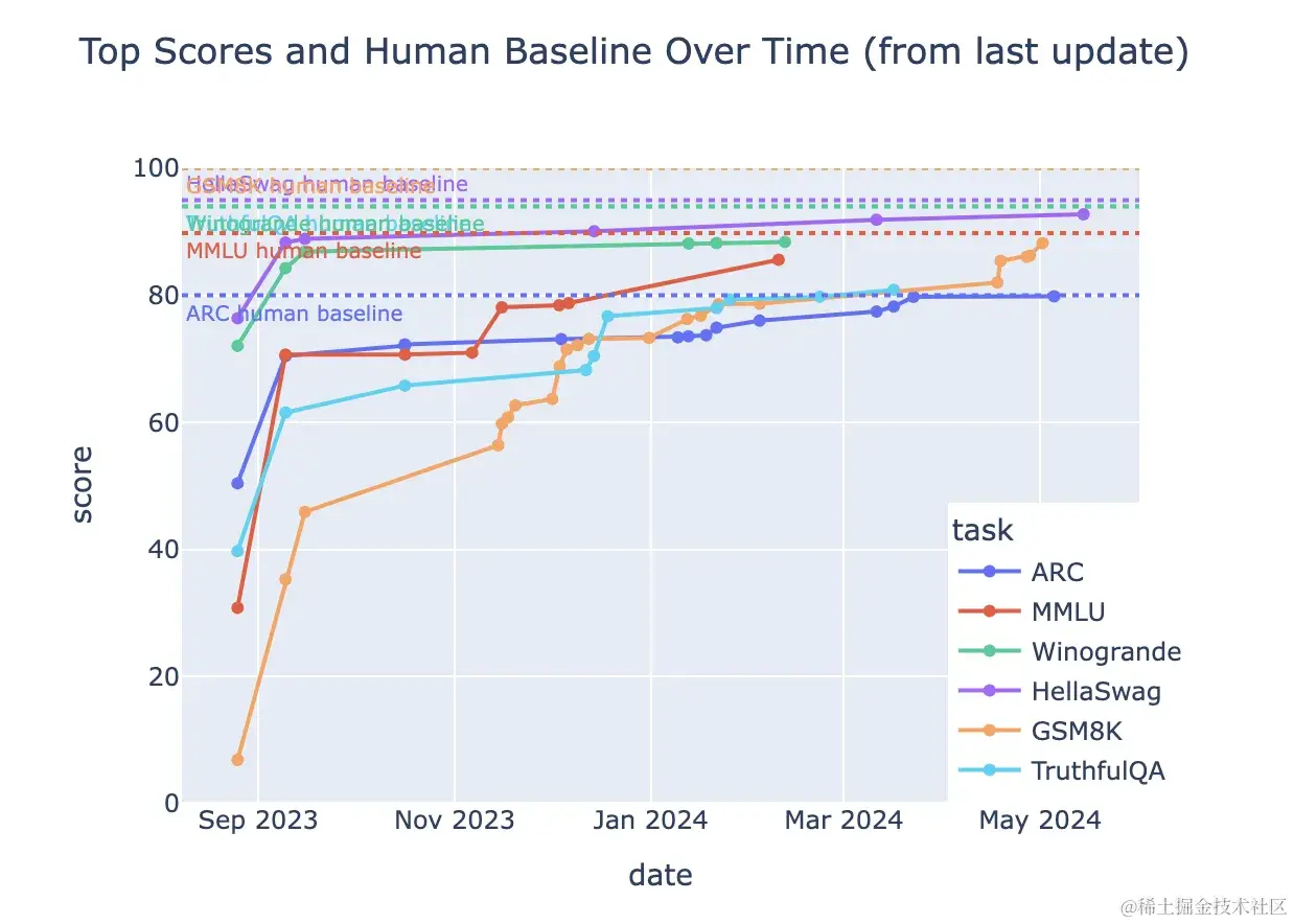 - 它们对模型来说变得太容易。例如,模型现在在 HellaSwag、MMLU 和 ARC 上达到了人类基准性能,这种现象被称为饱和。