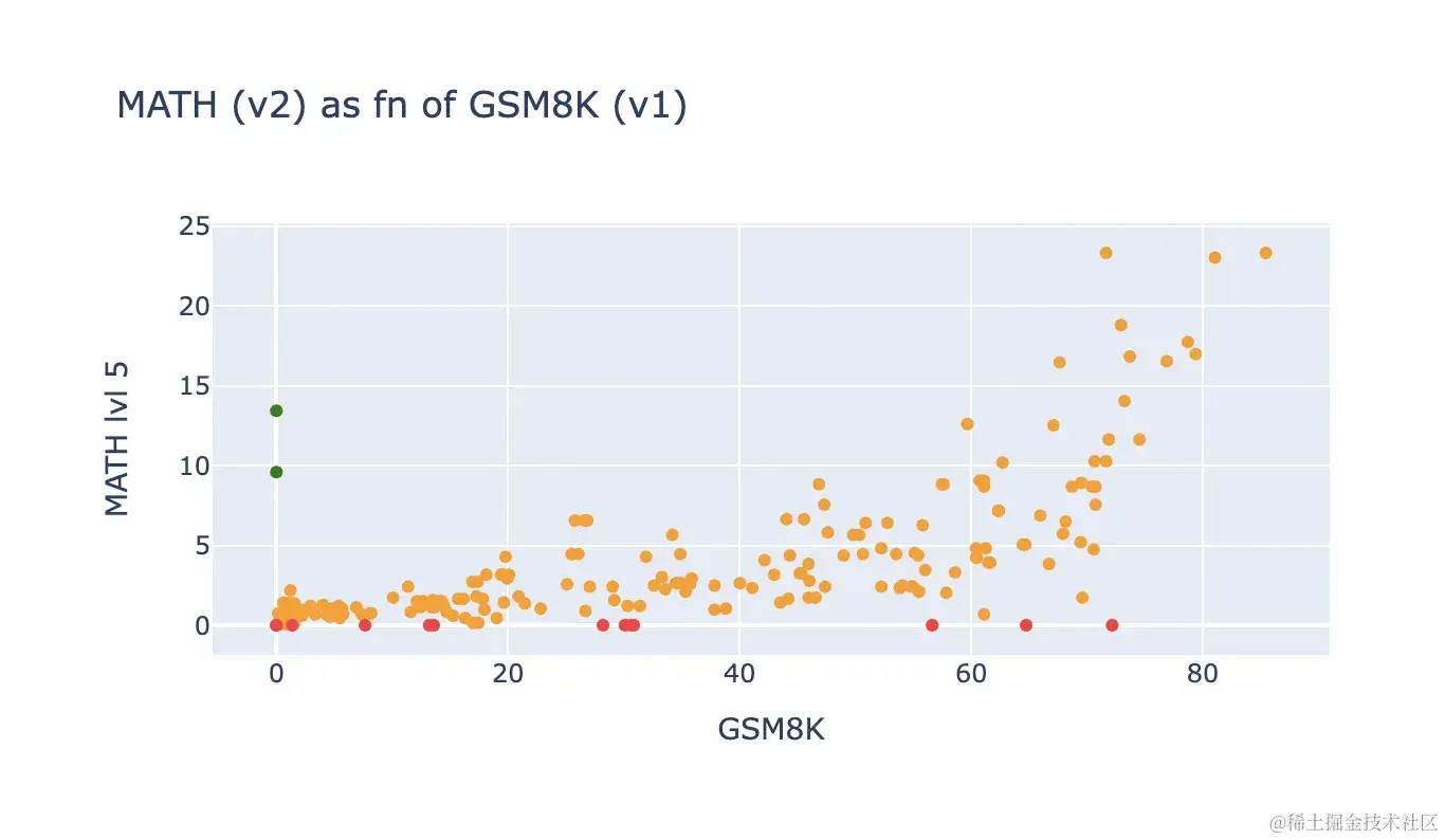 绿色点突出了在 GSM8K 上由于上述评估限制而之前得分为 0 但现在在新基准 MATH-Level5 上得分非常不错的模型。这些模型(主要来自 01-ai)在之前的格式中被严重惩罚。红色点显示了在 GSM8K 上得分高但在 MATH-Lvl5 上几乎为 0 的模型。