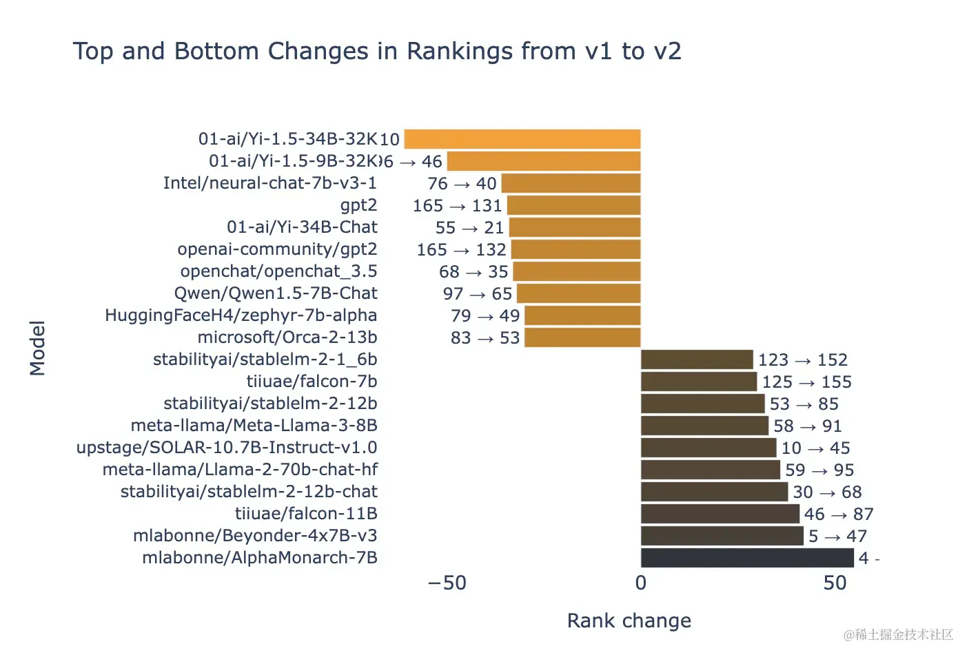 看看 Open LLM Leaderboard 之前版本的前 10 名模型,并与这个更新版本进行比较,一些模型的排名相对稳定(如下加粗):Qwen-2-72B instruct,Meta 的 Llama3-70B instruct,01-ai 的 Yi-1.5-34B chat,Cohere 的 Command R + model,以及最后来自 AbacusAI 的 Smaug-72B。