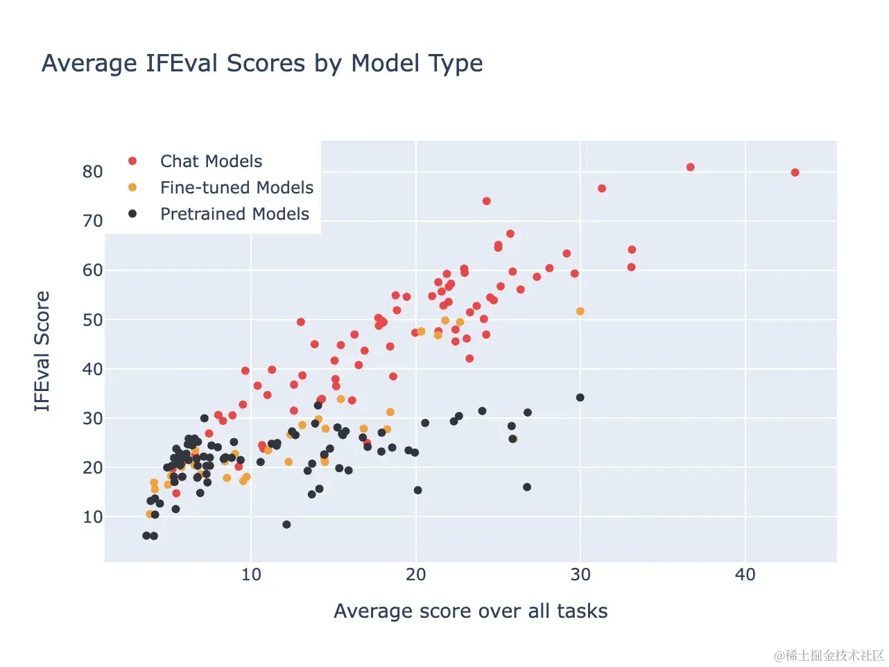 我们的另一个基准,IFEval,针对聊天能力。它调查模型是否能够遵循精确指令。然而,这个基准使用的格式倾向于有利于聊天和指令微调的模型,预训练模型难以达到高性能。