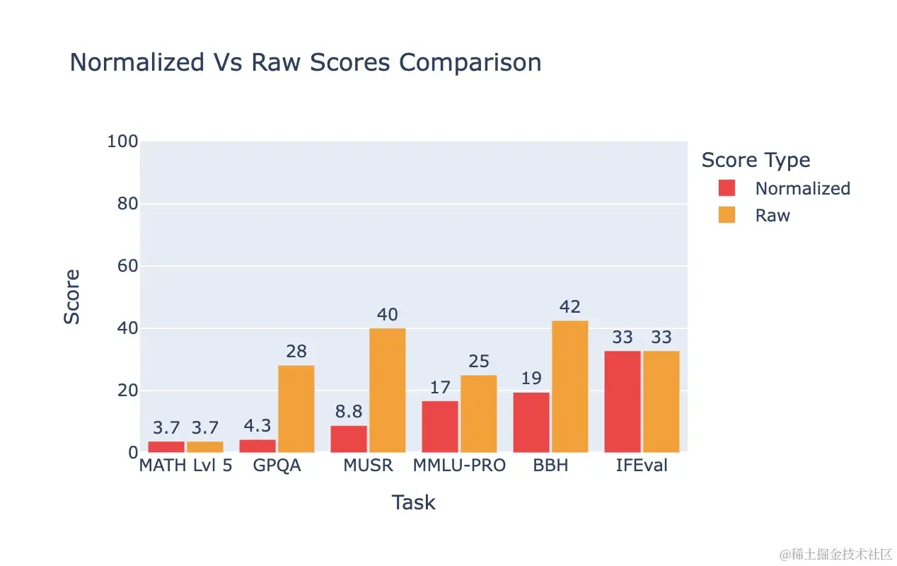 我们决定改变模型的最终得分。我们没有将每个基准输出得分相加,而是将这些得分标准化在随机基线(0 分)和最大可能得分(100 分)之间。然后我们平均所有标准化分数以获得最终平均得分并计算最终排名。例如,在一个每个问题包含两个选择的基准测试中,随机基线将获得 50 分(满分 100 分)。如果使用随机数生成器,您可能会在此评估中获得约 50 分。这意味着得分始终在 50(如果基准不是对抗性的最低合理得分)和 100 之间。因此,我们更改范围,使得 50 的原始分数为 0 的标准化分数。这对生成性评估如 IFEval 或 MATH 没有影响。