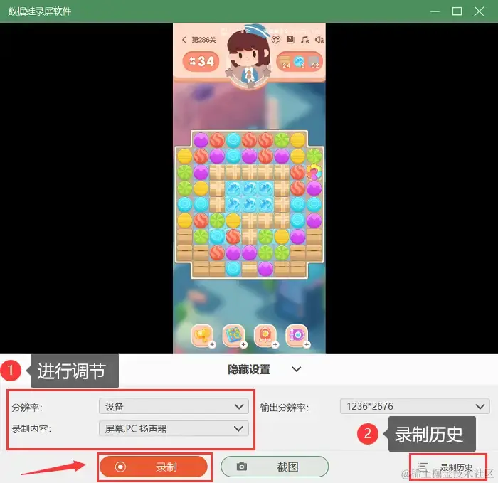 步骤4:连接成功后把手机屏幕投屏到电脑上,进行录制前可以对分辨率等进行调节,帮助您录制出高质量的视频。调节结束后,点击 【录制】 即可开始录制。录制好的视频您可以在 【录制历史】 中找到。