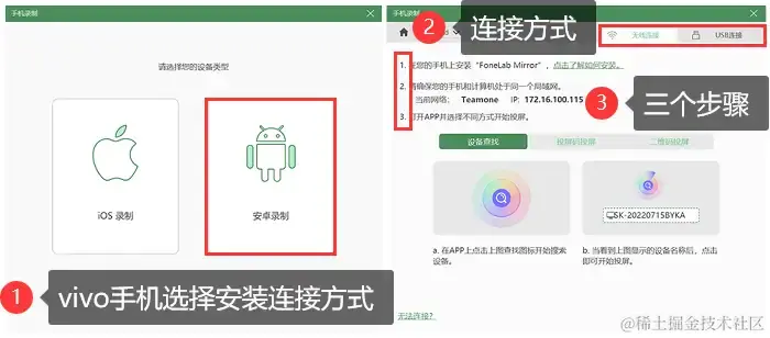 步骤3:先选择设备的类型,这里Vivo手机选择安卓录制,选择连接方式,根据屏幕提示的步骤进行连接。