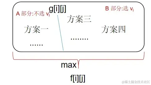通过上面分析,我们可以知道,g[i][j] 可以分成两部分,A 部分是不包含第 i 种物品对应所有选法获的价值的集合,最大值是 f[i - 1][j]。B 部分是包含第 i 种物品对应所有选法获的价值的集合,最大值是 f[i-1][j - vi 𝑣 𝑖 ] + wi 或 0。所以 g[i][j] 的最大值就是在 A 部分的最大值与 B 部分的最大值取个max,也就是: