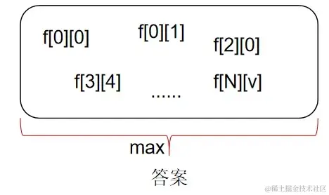 如果我们能把所有集合对应的最大值都求出来,即求出了 f[0][0] ~ f[N][V], f[N][V] 的含义是在前 N 种物品中进行选择,总体积不大于 V 所获得的最大价值,就是我们要找的答案。