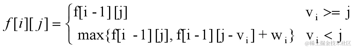 给定的容量能放下第 i 件物品,那么第 i 件物品会占据 vi的背包空间,剩下的背包空间为 j - vi 。可以继续从前 i - 1 种物品中,选出的物总体积小于等 j - vi的物品放入背包中。