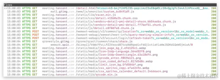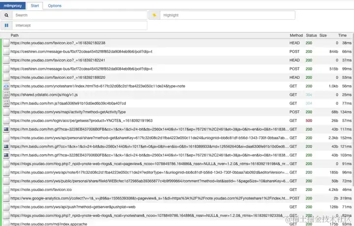 在 mitmweb 的图形界面中使用 mitmproxy 的主要功能,通过命令mitmweb启动。它和 Chrome 开发者工具中的 network 比较类似。下图为 mitmweb 启动后的效果图: