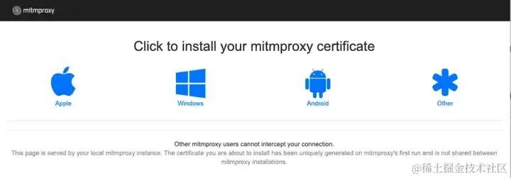 - 在浏览器输入地址 mitm.it,显示效果如果和下图相同,证明前面的步骤都成功了