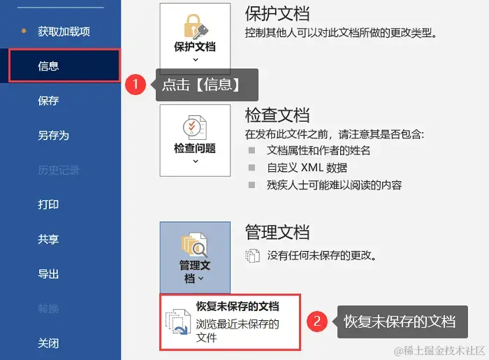 步骤2:在文件菜单中,选择【信息】栏,找到【管理文档】下的【恢复未保存的文档】;