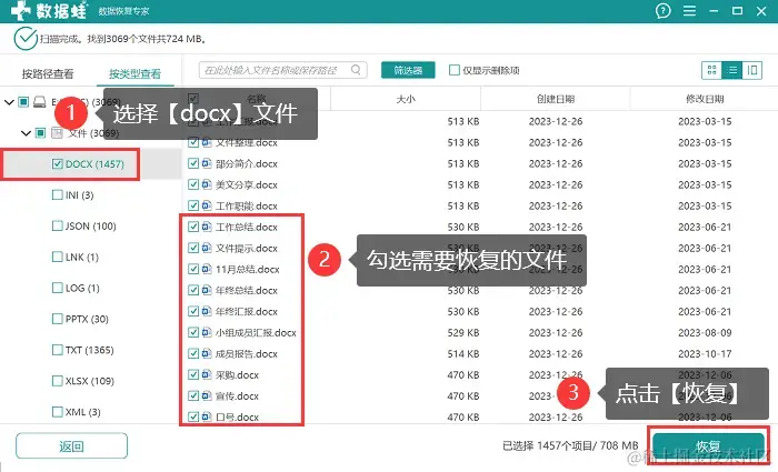 步骤3:选择【docx】类型查看Word文档,将需要恢复的文件都勾选完成后,点击 【恢复】,并为恢复后的文件选择合理的保存位置。
