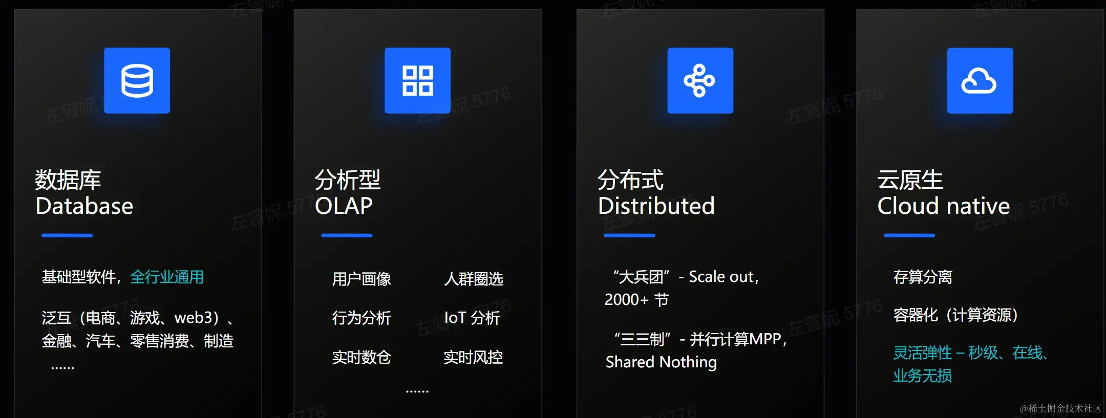 总结来看,卓越性能能够快速处理海量数据,在各个场景中实现高效运算;秒级无损弹性弹性,使成本更加可控,更具性价比;一体化架构,将数据处理的各个环节紧密融合,从智能化、轻量化角度增强产品能力,减少用户操作成本;全场景覆盖,能规避“七国八制”现象,最大化数据效能;生态多元化,则能与众多不同类型的技术和产品良好兼容,形成强大的生态体系,共同为用户提供更优质的数据服务。