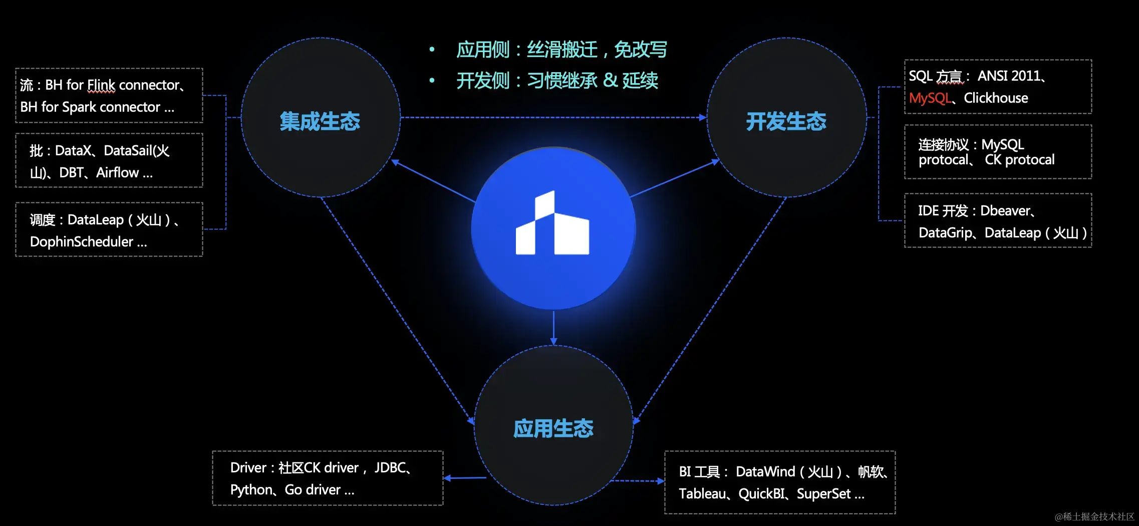 因此,ByteHouse主要是围绕集成生态、开发生态和应用生态来迭代和提升。