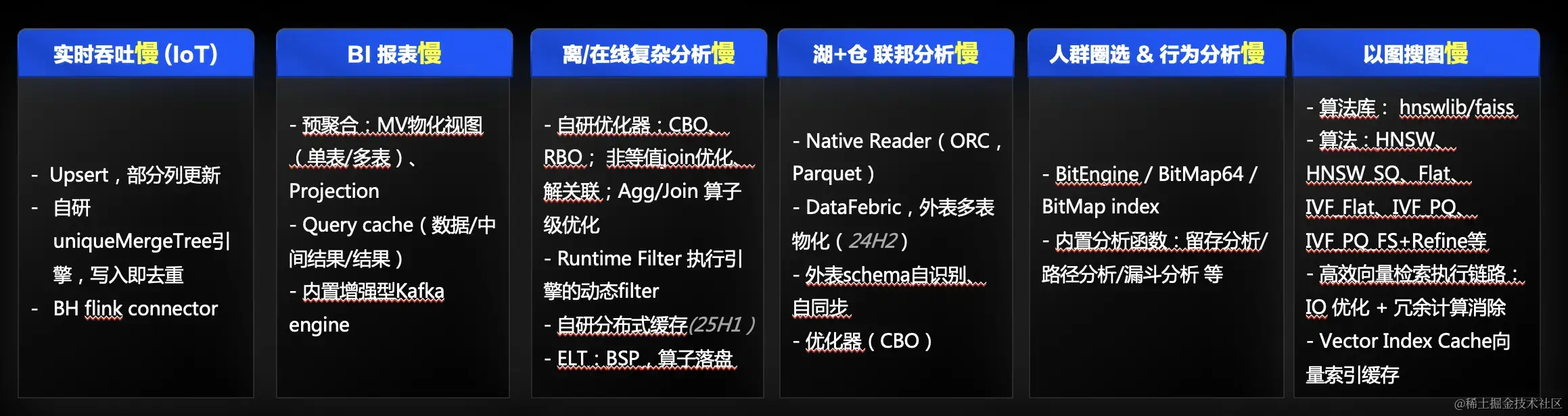 最为首要且关键的核心能力是性能。在 OLAP 领域,性能是一个永恒的追求。在下图的六个场景中,都存在着各种性能问题。
