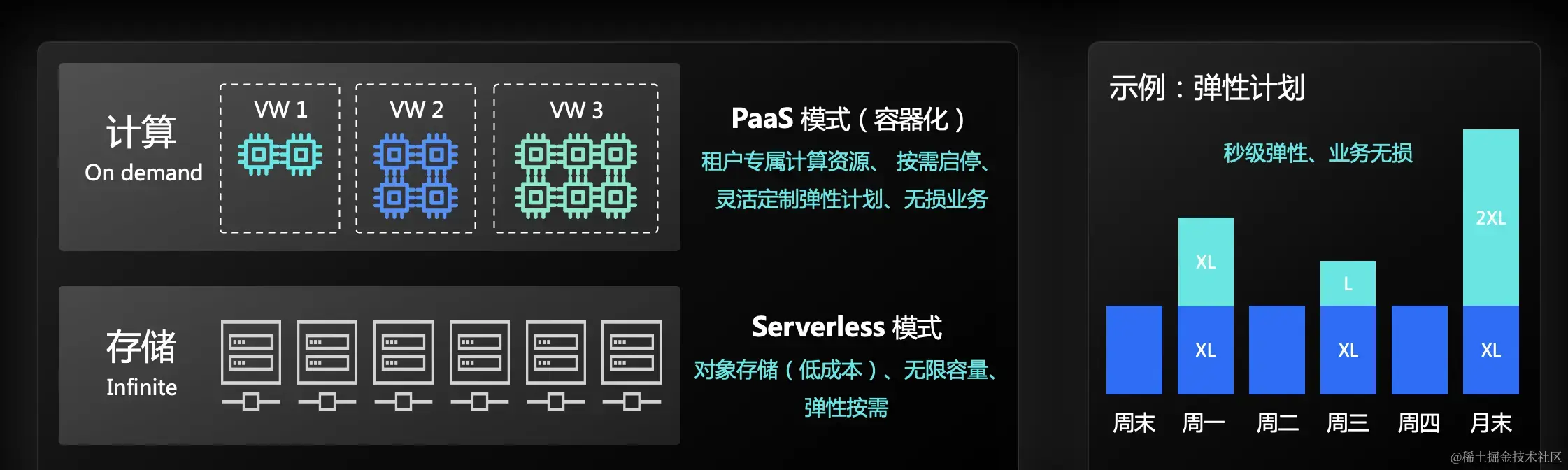 虽然我们能在资源隔离、干预甚至主动干预层面做一些努力,但基于一套系统里实现,尤其是在叠加多租户、高并发场景下,这样的干预往往效果不佳。 ByteHouse 则选择了另一条技术路线,即在计算方面基于容器化实现无状态或弱状态化,保证计算资源在秒级内实现弹性拉起和弹性扩缩容。 ByteHouse 将整个计算组包装成租户和应用呈现给用户,这部分计算资源实是专属的,即 PaaS 化,充分保证租户之间不会发生资源征用冲突或性能劣化的情况。 在弹性层面,ByteHouse 当前支持计划内的弹性,正在开发基于 workload 的智能动态弹性。用户可以根据自身负载特征定制弹性计划,触发后,整个弹性过程只需 20 多秒,即可将计算资源弹上去或缩下来。