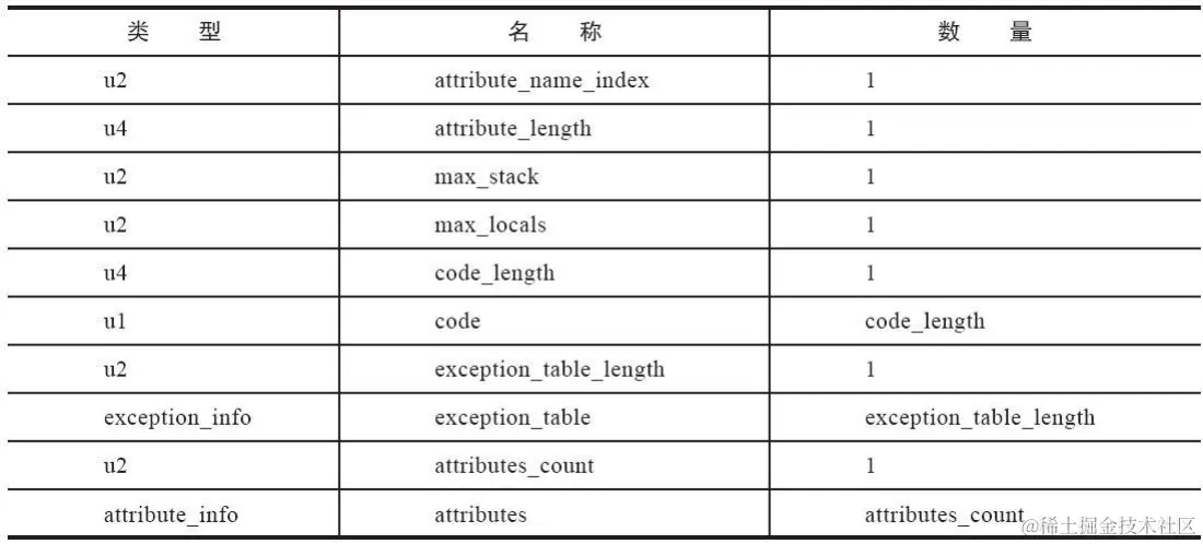 code_length 和 code 用来存储 Java 源程序编译后生成的字节码指令。 code_length 代表字节码长度, code 是用于存储字节码指令的一系列字节流。