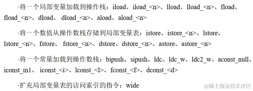 举个例子,iload 指令用于从局部变量表中加载 int 型的数据到操作数栈中,而 fload 指令加载的则是 float 类型的数据。