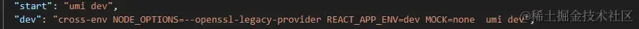 - 在package.json 文件中script 的运行命令添加环境变量 NODE_OPTIONS=--openssl-legacy-provider 但此环境变量适用于node17+版本, 如下:
