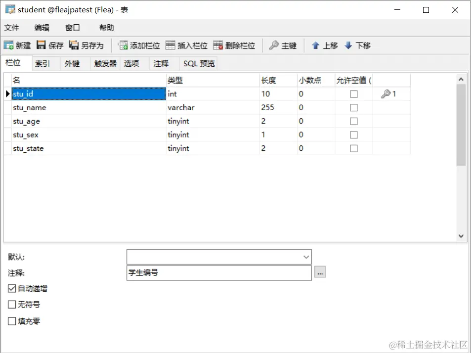 Long stuId: 学生编号【主键】。在笔者的《JPA主键生成策略介绍》 中,介绍了GenerationType.IDENTITY【适用于支持 主键自增长 的数据库系统,比如 MySQL】,详细内容可自行查看。String stuName: 学生姓名【非空】Integer stuAge: 学生年龄【非空】Integer stuSex: 学生性别(1:男 2:女)【非空】Integer stuState: 学生状态(0:删除 1:在用)【非空】