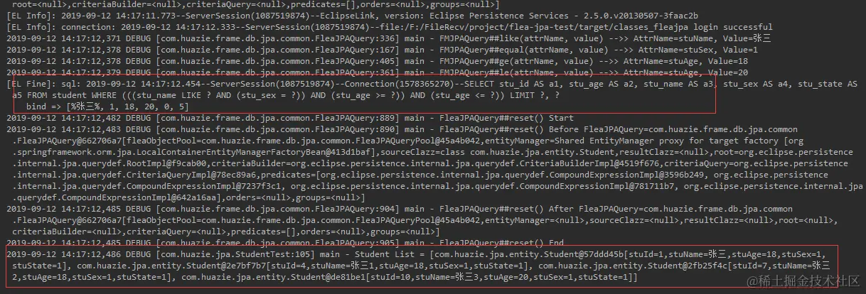 getQuery(result):在《flea-db使用之JPA封装介绍》 中的抽象 Flea JPA DAO 层实现可以看到,通过 Flea JPA 查询对象池来获取FleaJPAQuery。like("stuName", name):根据姓名模糊查询,attrName为 实体类对应的成员变量名,并非表字段名equal("stuSex", sex):查询性别(等于)ge("stuAge", minAge):查询年龄范围 (大于等于)le("stuAge", maxAge):查询年龄范围 (小于等于)