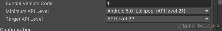 根据你的项目配置SDK的版本,这里的SDK版本指的是Unity里的Target API Level,如果开发谷歌商店的应用 API Level不能低于33,由于我这边的gradle最高支持到31,所以选择不高于31的SDK版本。